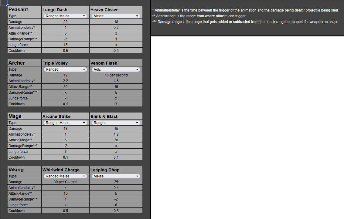 The Balancing Matrix: I used a structured spreadsheet to manage every frame of the combat experience. This allows for rapid iteration on: